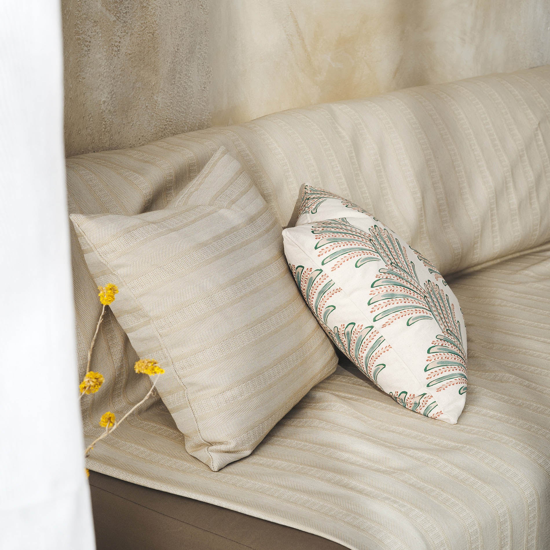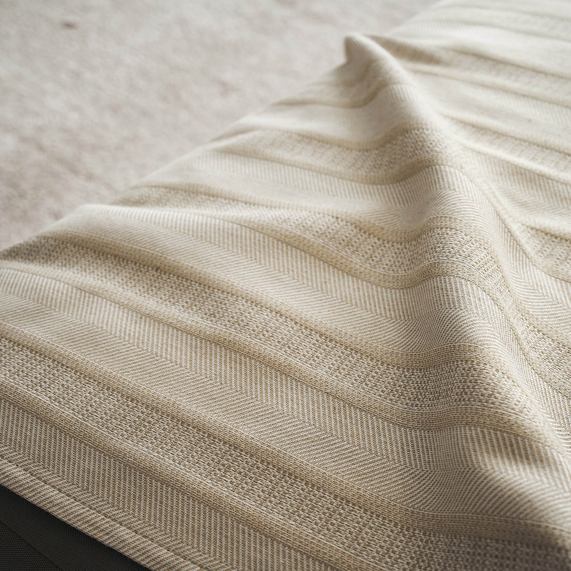 Combed cotton, solid color sofa throw with a striped pattern in the weave and fringe on both sides. The worsted yarn gives a pleasant feel to the touch as well as keeps the quality and appearance of the fabric stable for a longer period of time.